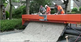 Tiger-Stone is a Dutch paver laying machine that can produce brick roads. Paving bricks are put onto the angled plain. As the electric crawler moves forward along a sand base layer, all the stones are packed together by gravity.